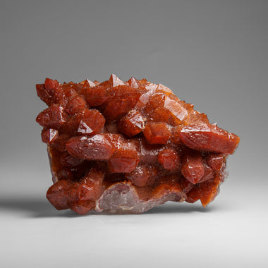 Large cluster of transparent reddish orange quartz crystals with coloration caused by microscopic spherical hematite inclusions on matrix lined wit...