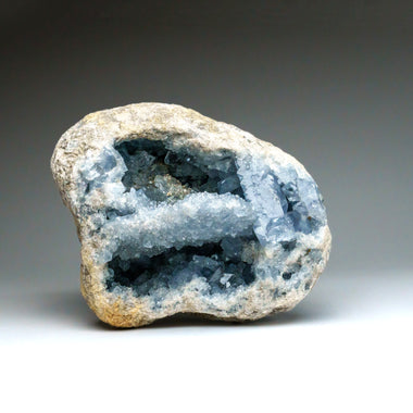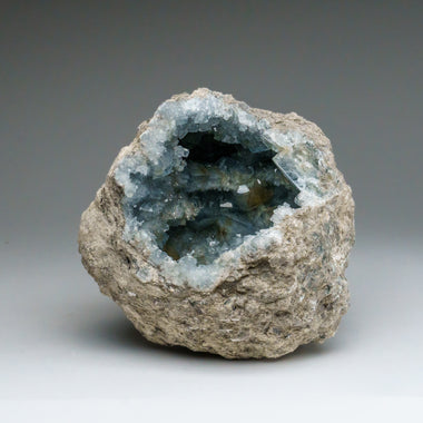 This unique Madagascan Blue Celestite Cluster exhibits large, gem crystals of remarkable quality, featuring prism faces and sharp chisel-terminatio...