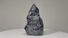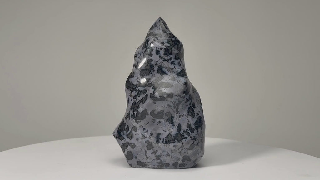 This solid Indigo Gabbro flame freeform, also known as Mystic Merlinite, is hand polished to a beautiful shine. Its composition of feldspar, quartz, and igneous rock create a unique pattern, making for its distinctive look. Polished to smooth mirror finish and is a perfect addition to any crystal collection.