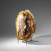 This beautiful hand polished petrified wood slice is sourced from Madagascar and comes with an elegant metal display stand. It has an amazing pattern with vibrant hues of brown, yellow, and orange. Fossilized Petrified Wood, which is also known as Agatized Wood, forms when a tree has died and silicon dioxide forms in place of the wood - that degrades until there is no wood left, only Quartz. All of the organic matter becomes replaced by minerals, while much of the original structure, such as tree rings, is retained. The rainbow of colors is produced by impurities in the quartz, such as iron, carbon, and manganese. Most petrified wood on earth can be from 50 to 500 million years old.