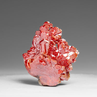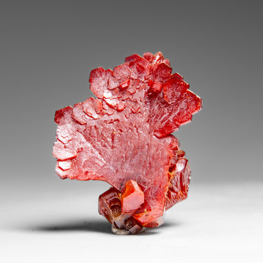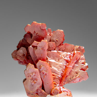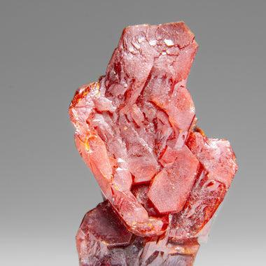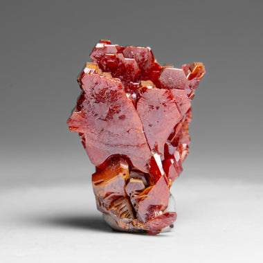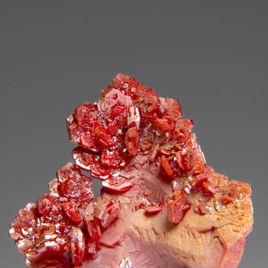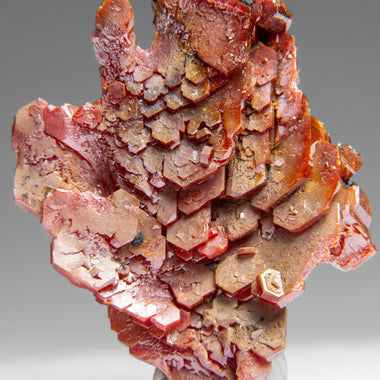 Large 6" penetrating twinned crystals of transparent rich golden yellow calcite with silky luster faces and sharp terminations on druzy quartz matr...