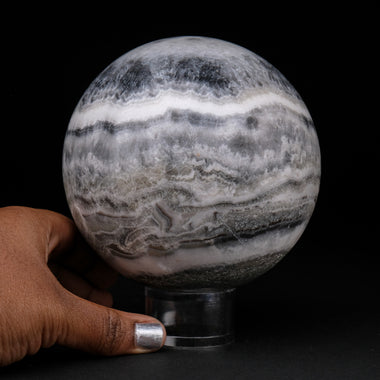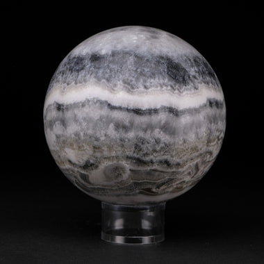 A beautifully polished Mexican onyx Sphere. It has an amazing pattern with vibrant hues of white, black and yellow. Well defined banding all around...