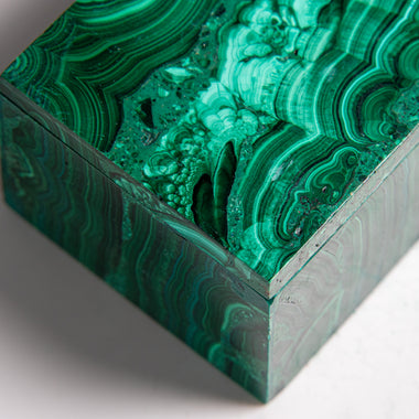 Beautiful rectangle jewelry box handmade from the finest top grade natural bulls eye Malachite from Congo, with rich translucent to transparent gre...
