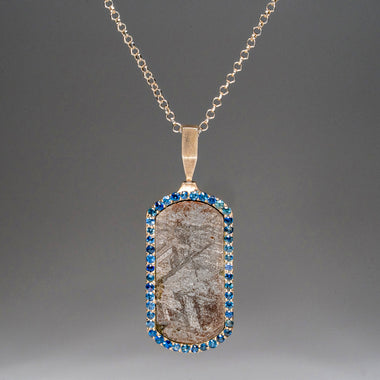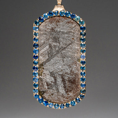 This genuine Muonionalusta meteorite dog tag pendant with CZ stones is a type IVA (Of) octahedrite, thought to have impacted northern Scandinavia o...