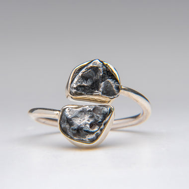 This is a Unique Campo del Cielo Meteorite nugget set in sterling silver ring (14.3 grams). This meteorite has a subtle metallic sheen with its we...