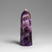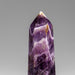 This top quality polished chevron amethyst point exhibits a vibrant purple hue and clarity that ranges from translucent to transparent. Chevron Amethyst consists of Amethyst and White Quartz interwoven in a distinctive V-shaped or banded pattern. It merges the amplifying and strengthening effects of Quartz with Amethyst’s natural ability to alleviate stress.