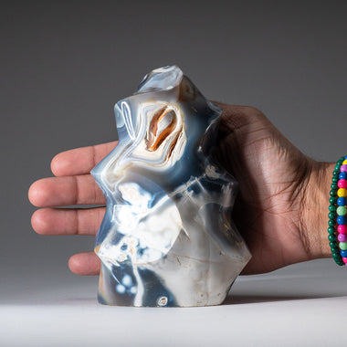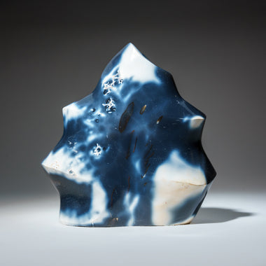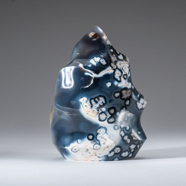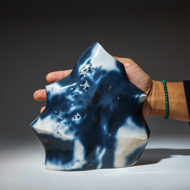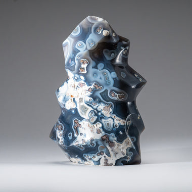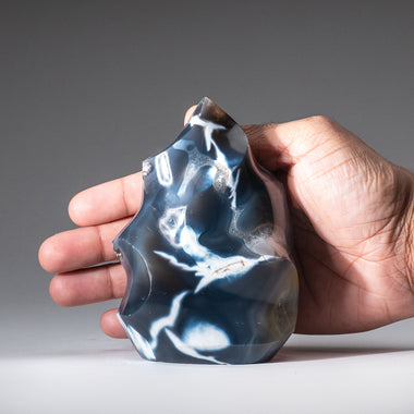 This genuine, polished Madagascan blue chalcedony agate, also known as orca stone, boasts high quality with striking white to grey, greyish-blue to...