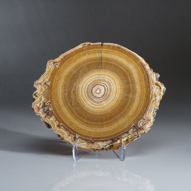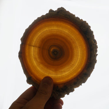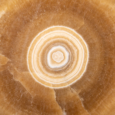 AAA quality, rare find translucent perfect bullseye yellow Aragonite stalactite slice. Polished on front and rear sides. Aragonite is a naturally o...