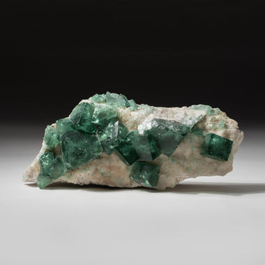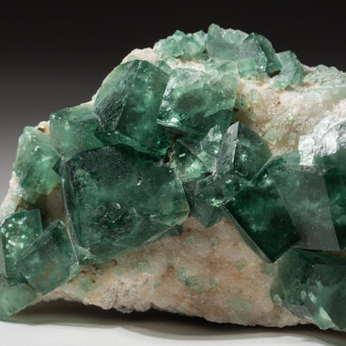 Transparent green cubic fluorite crystals with slightly textured crystal faces that are composed of microscopic octahedral faces. The bright green ...
