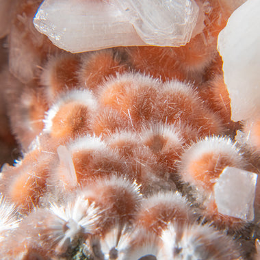 From Soygaon, Aurangabad District, Maharashtra, IndiaLarge cluster of spherical balls of Thomsonite covered with mesolite crystals all over a bed o...