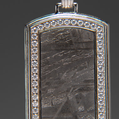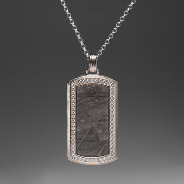 This genuine Muonionalusta meteorite dog tag pendant with CZ stones is a type IVA (Of) octahedrite, thought to have impacted northern Scandinavia o...