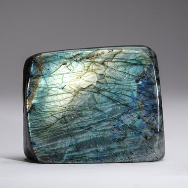 Top quality, polished Labradorite freeform with beautiful iridescent play of colors of blue, yellow and purple which is caused by internal fracture...
