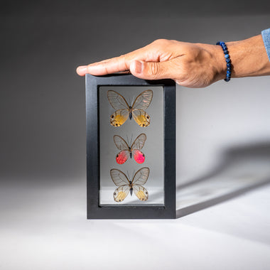 15 bright and vibrant iridescent butterflies permanently enclosed in an acrylic frame for a lifetime of beauty. 8.5 lbs, 12 x 12 x 2 inches