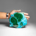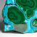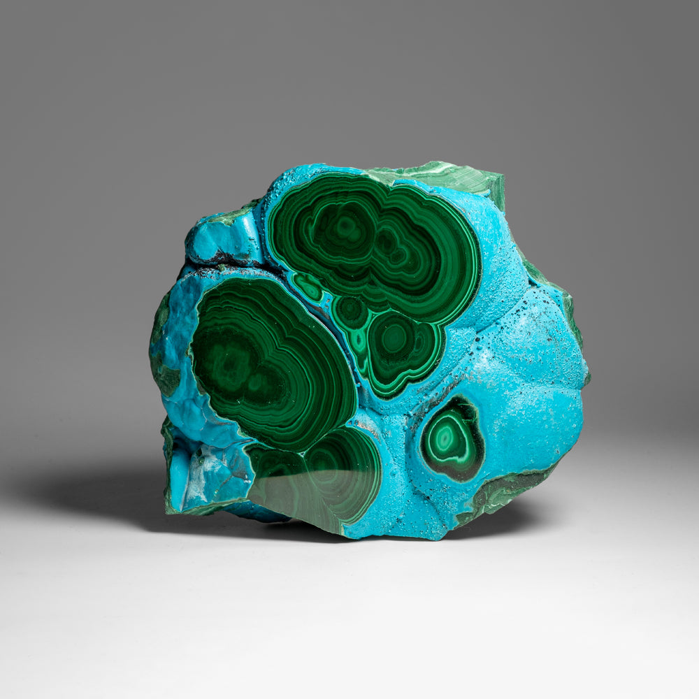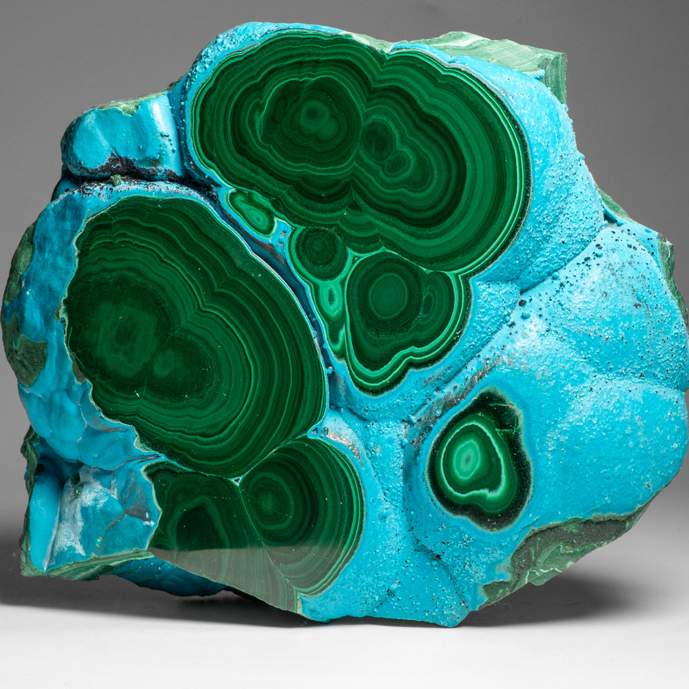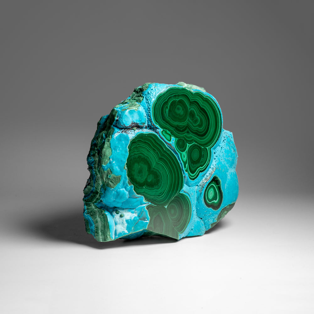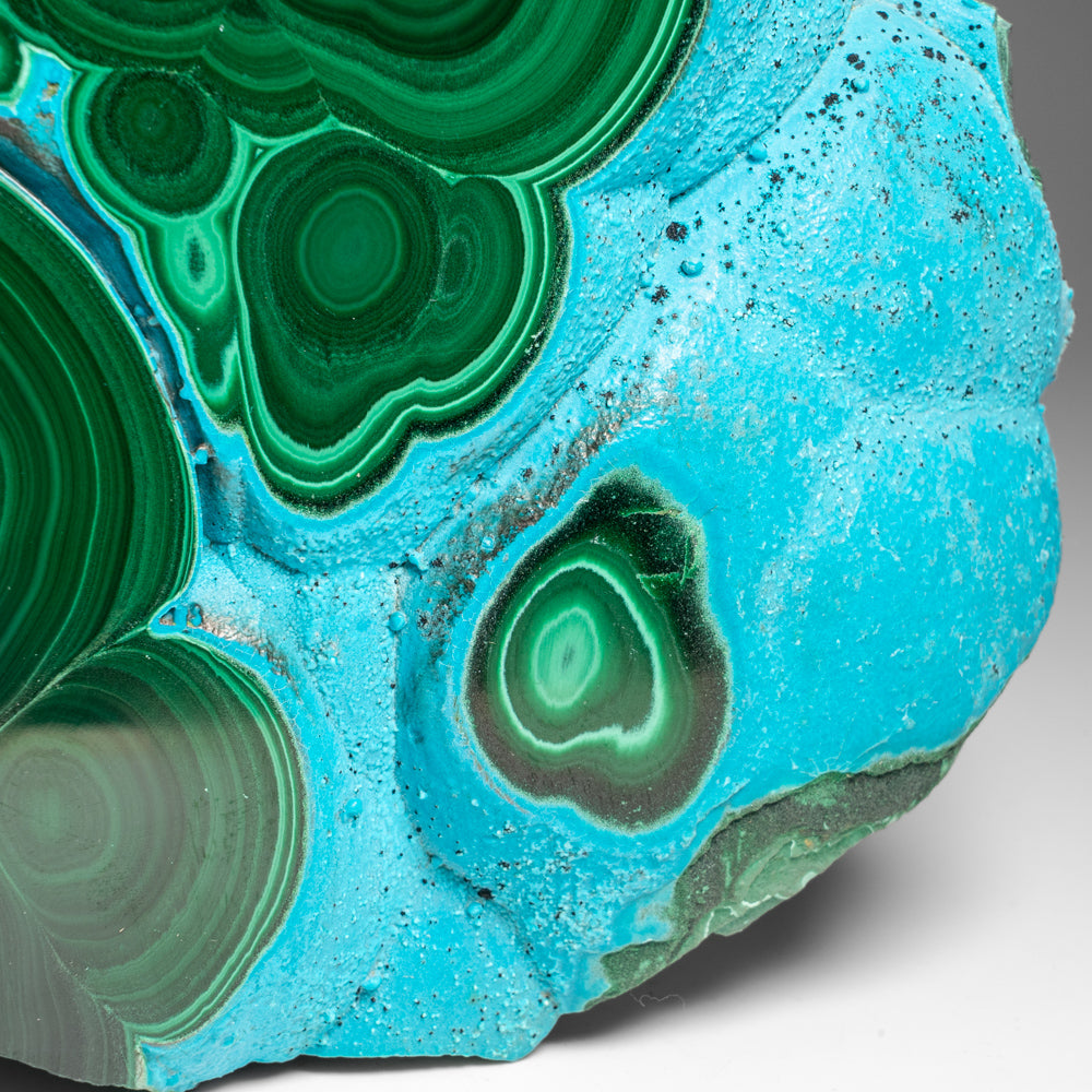 This is a gorgeous, colorful doubly polished Malachite and Chrysocolla slice from the Congo. Boasting intricate and artistic textures consisting of well-defined, thick, concentric and alternating rounded bands of rich green Malachite and sky-blue Chrysocolla. The rare combination of botryoidal Malachite and Chrysocolla, both sides of the piece are beautifully polished, with slight variations that add to its captivating character. This mineral-related object is a must-have for any crystal display, providing an elegant and complementary accent.