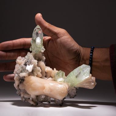 From Jalgaon, Aurangabad District, Maharastra, India Exceptional formation of vivid green apophyllite crystals on matrix with large pink stilbite c...