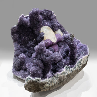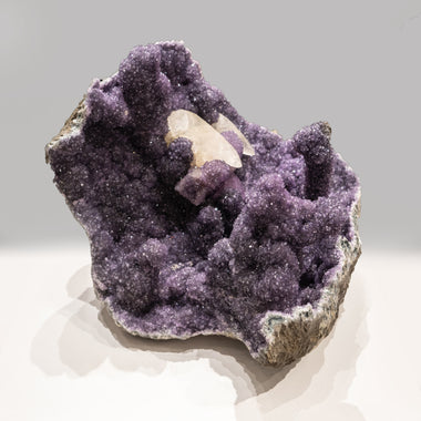 This Authentic Amethyst Cluster Geode from Brazil is a premium natural formation of gem amethyst adorned by small, smooth calcite crystals. The sem...