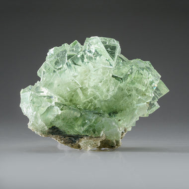 from Jalgaon, Maharashtra, India Large specimen of lustrous green apophyllite crystals in isolated clusters on druzy chalcedony matrix. The apop...