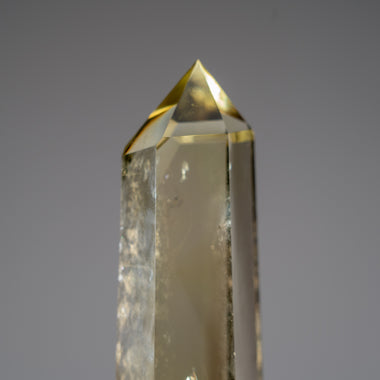 Top quality, lustrous gem translucent yellow fluorite polished point. This specimen has bright rich honey yellow color and displays a base of ether...