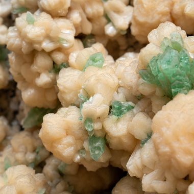 Sparkling cluster of green apophyllite crystals in a radiating formation on matrix lined with creme-colored stilbite crystals in aggregates. The ap...