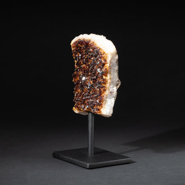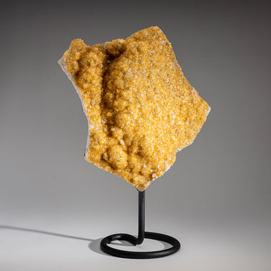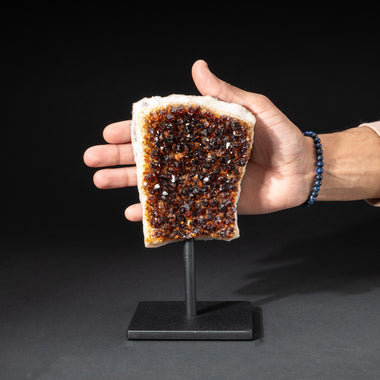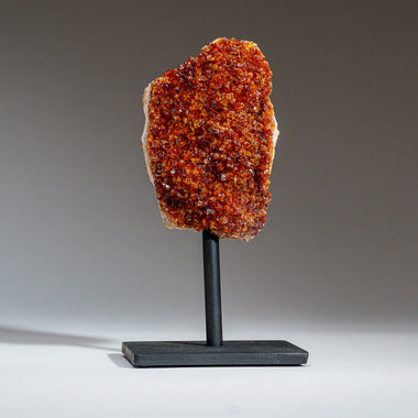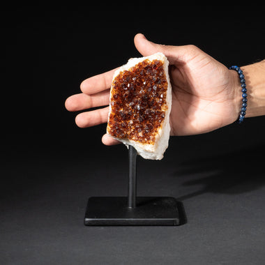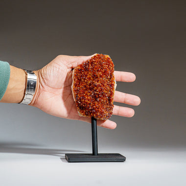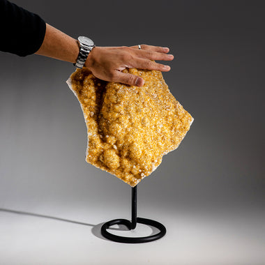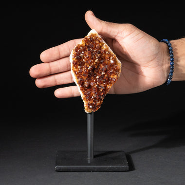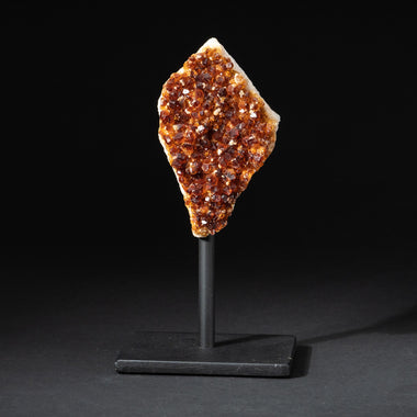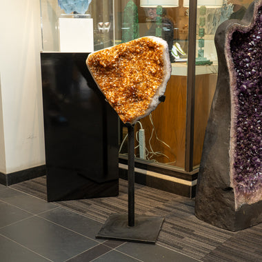 Top quality Brazilian Citrine crystal cluster free-form mounted on a black metal stand. This beautiful specimen has vibrant orange/yellow color wit...