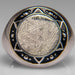 The bold round face is framed by intricate silver detailing, including darkened accents and bead-like elements that add depth and contrast create a powerful, masculine aesthetic, while a small accent gemstone set into the side adds a subtle yet refined touch. The interior is smoothly polished for comfortable everyday wear.