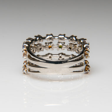 Beautiful, sterling silver 10mm stacking ring featuring rows of bezel-set tourmaline gemstones, offering a playful blend of sparkle and color in a...