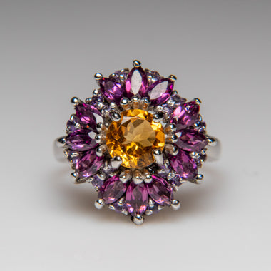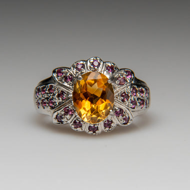 Elegant sterling silver ring featuring a radiant citrine gemstone accented by rich rhodolite garnets. The warm golden hues of citrine beautifully c...