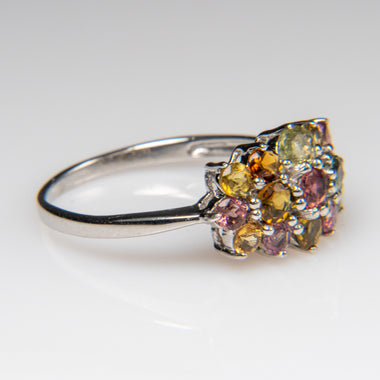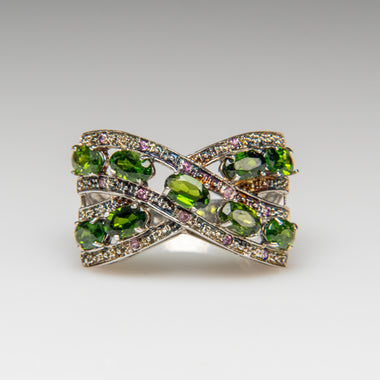 A vibrant sterling silver ring adorned with 15x10mm multi-tourmaline gemstones. The array of rich, colorful hues creates a lively and elegant desig...