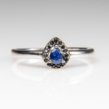 A stunning 7x5mm pear-shaped gemstone ring crafted in sterling silver, featuring a deep blue sapphire paired with a brilliant spinel. The elegant t...