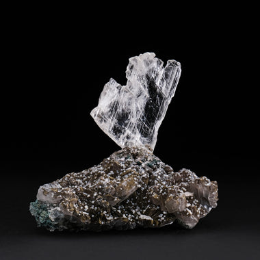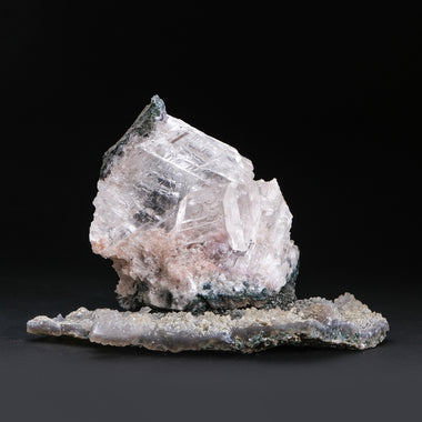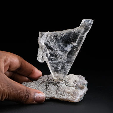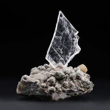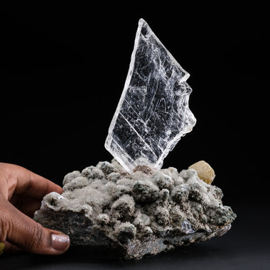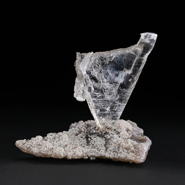 From Rio Grande do Sul, Brazil An aesthetic specimen of a 4" gem transparent gypsum var. selenite crystal on druzy quartz matrix. The specimen has ...