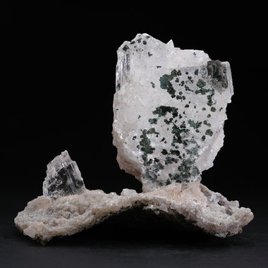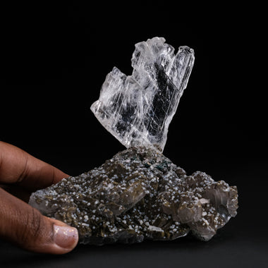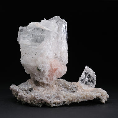 From Rio Grande do Sul, Brazil An aesthetic specimen of a 2" gem transparent gypsum var. selenite crystal on druzy quartz matrix. The specimen has ...