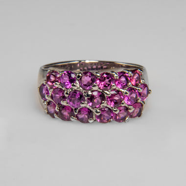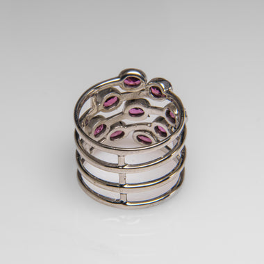 An elegant and modern design, this sterling silver 15mm ring showcases multiple oval Rhodolite gemstones set in an open, multi-band framework. The...