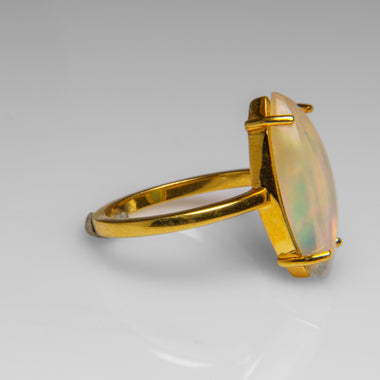 Featuring a radiant 5x15mm oval-cut opal, this sterling silver ring showcases the stone’s natural fire and iridescence. The smooth silver setting e...