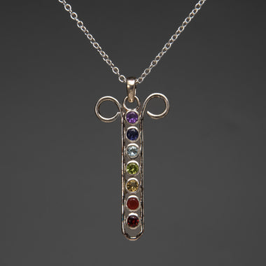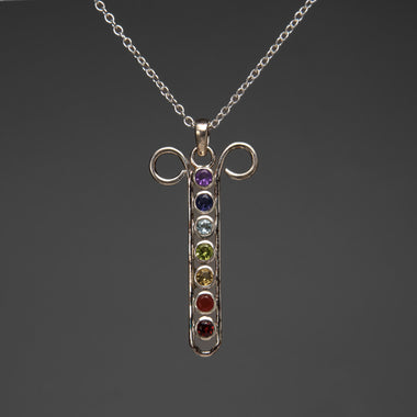 A stunning multicolored gemstone necklace featuring a radiant V-shaped design on a delicate silver chain. The vibrant stones create a dazzling disp...