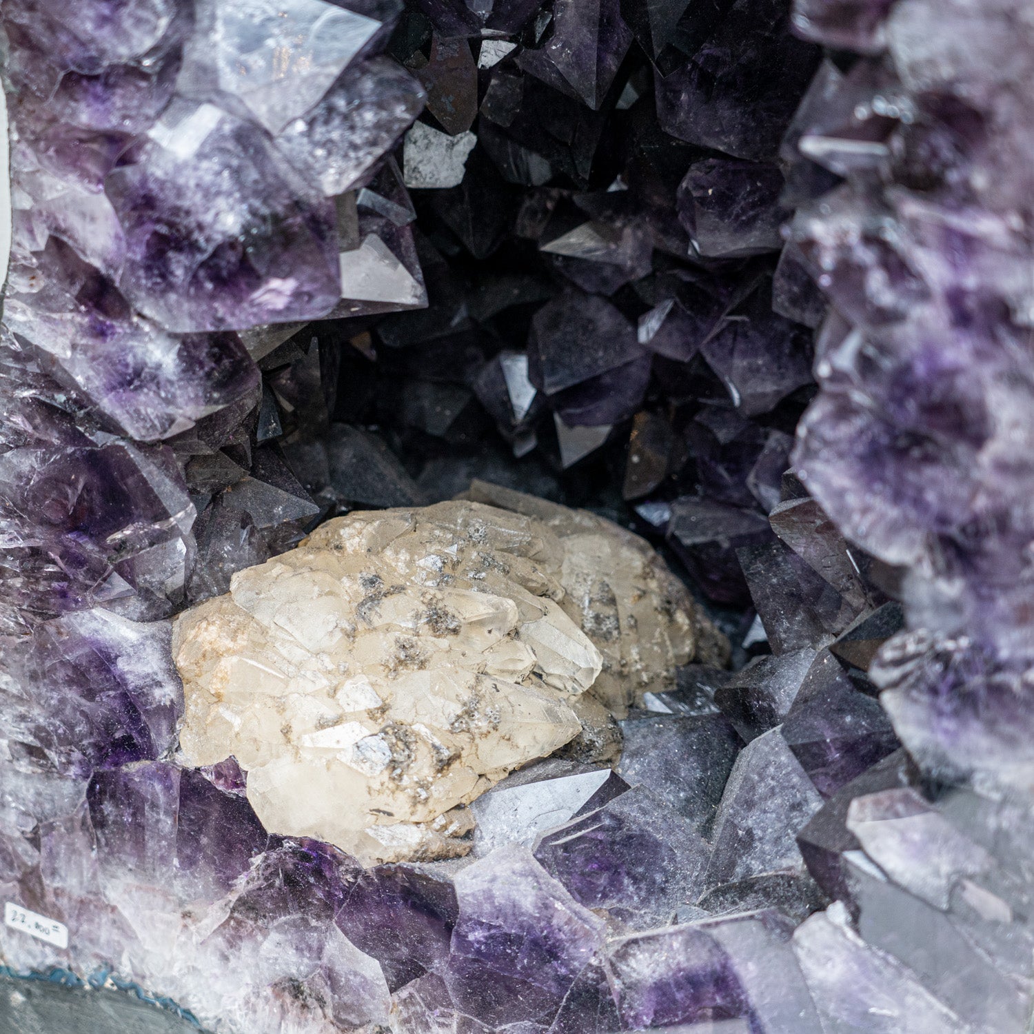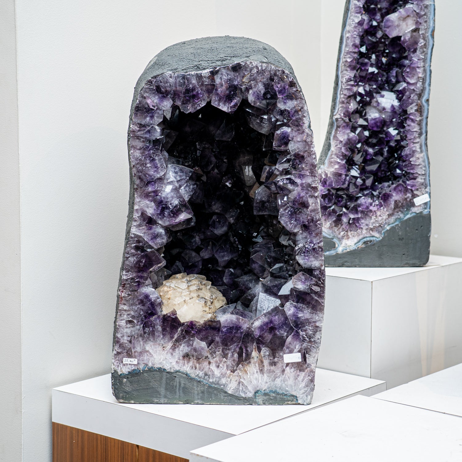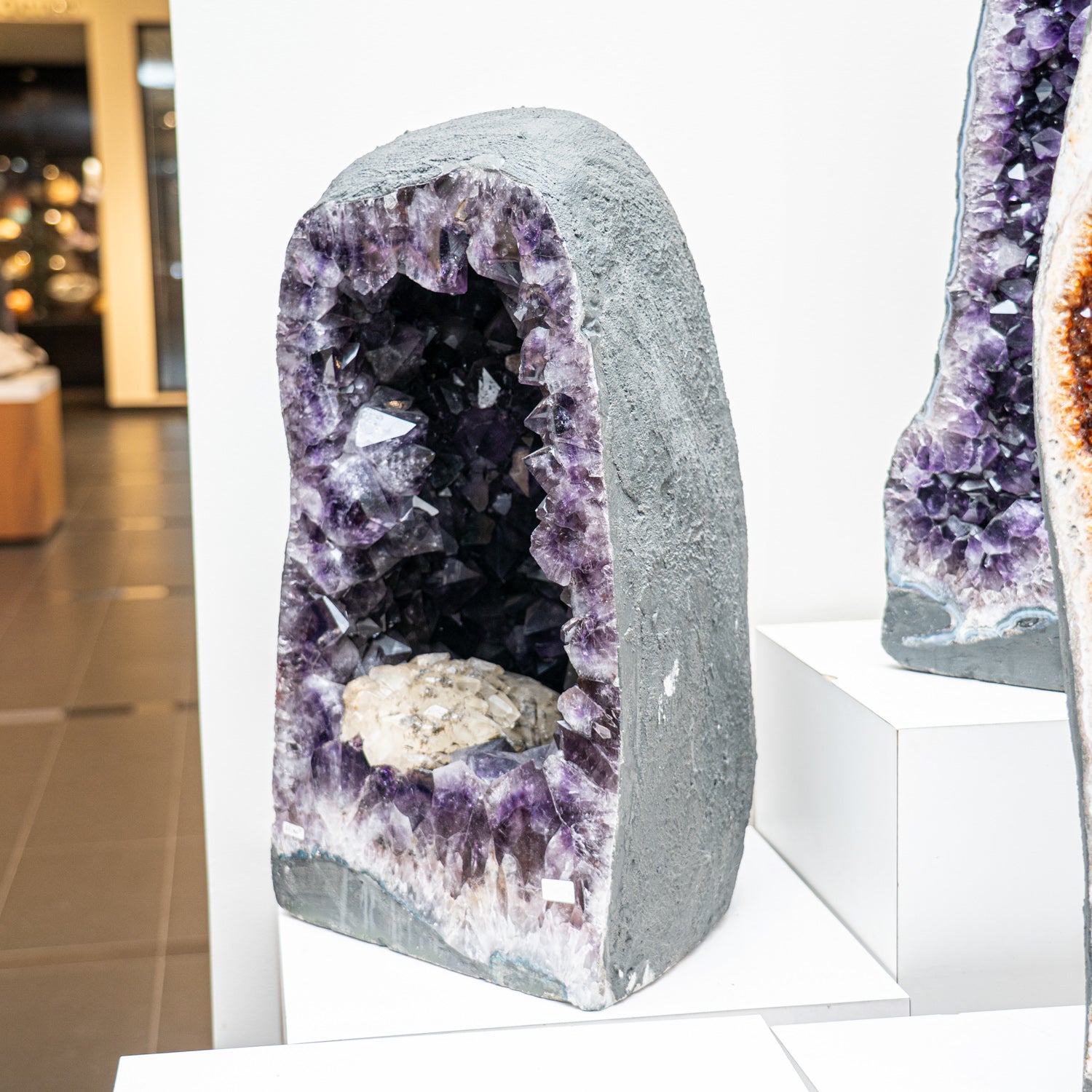 This Authentic Amethyst Cluster Geode from Brazil is a premium natural formation of gem amethyst adorned by small, smooth calcite crystals. The semi-geode cathedral decor showcases gleaming, fully terminated crystals with highly reflective surfaces and a deep, translucent amethyst hue. Amethyst geodes are mesmerizing, boasting incredible amethyst quartz crystal clusters formed within the amethyst cave-like structure. Elevate your living environment with this exquisite mineral specimen. Amethyst is widely recognized as a powerful and protective crystal by many metaphysical experts, known for its ability to elevate low vibrations and transform negative energy into pure love energy.