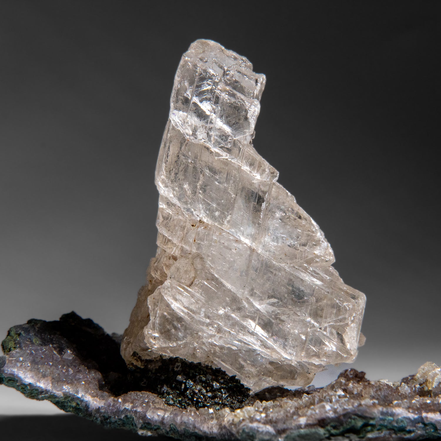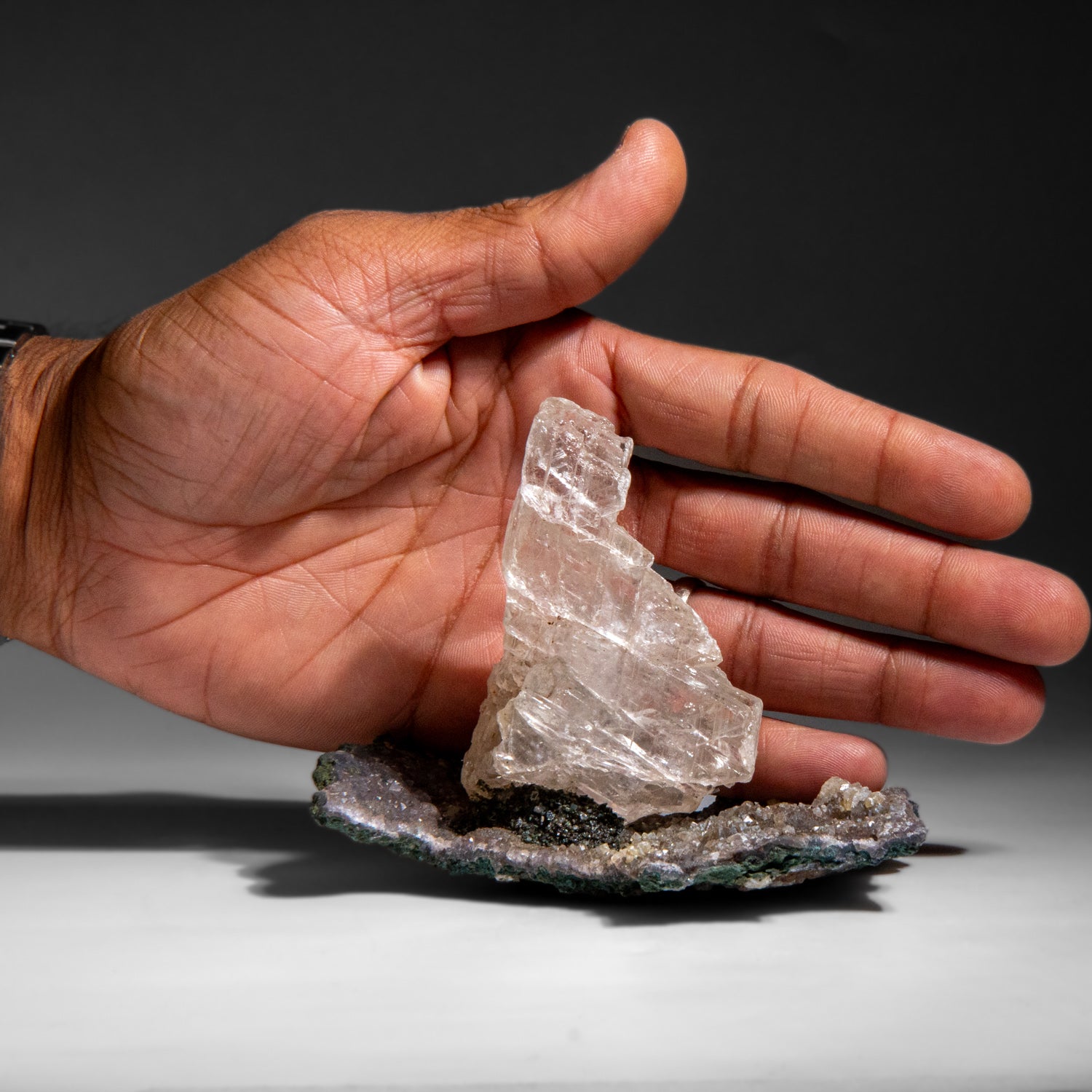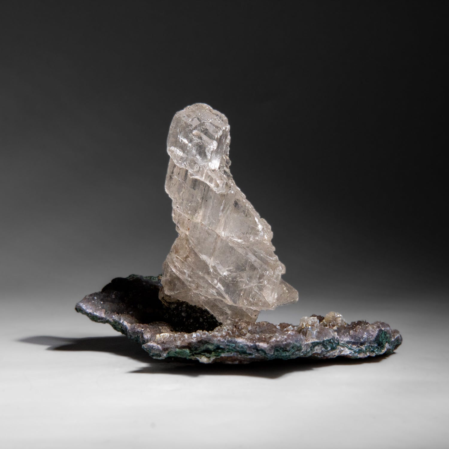 An aesthetic specimen of a 4.25" gem transparent gypsum var. selenite crystal on druzy matrix. The specimen has top quality transparency with a glassy luster and fully terminated crystal faces.