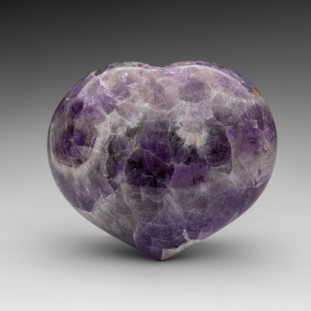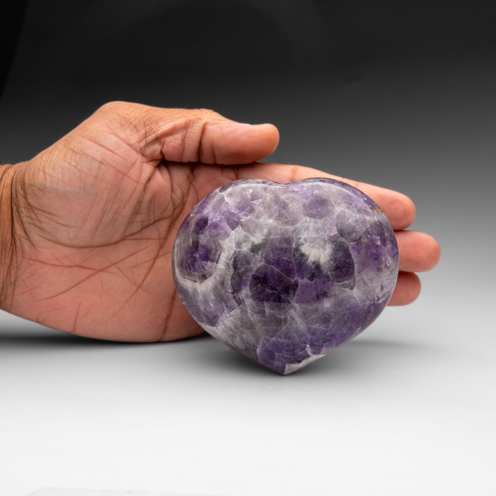 This premium polished chevron amethyst heart showcases a vibrant purple hue with translucent to transparent clarity. Chevron Amethyst features a distinctive V-striped pattern formed by the fusion of Amethyst and White Quartz. This unique blend merges Quartz’s amplifying properties with Amethyst’s calming effects, creating a deeply spiritual stone ideal for subtly unveiling hidden insights and enhancing personal growth.